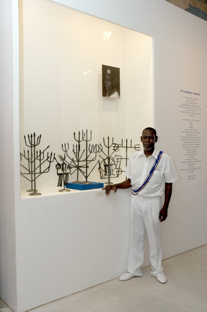 “Os artistas estão bem felizes. Seu José Adário, por exemplo, é um dos últimos artífices de paramentas e ferramentas para candomblé e orixás. Nesse acervo temos 17 obras dele, e em formatos que ele não produz mais”, explica Jamile Coelho. O artista de 77 anos fabrica portões, agogôs e ferramentas de santo há mais de seis décadas.