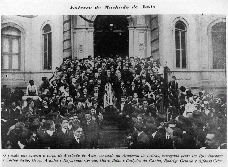 O contrato de venda de Quincas Borba para a editora francesa Garnier e a saída do caixão com o corpo do escritor rumo ao cemitério, no Rio – Imagem: Acervo ABL