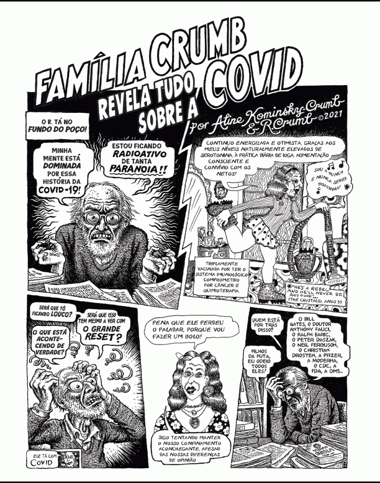 A frase aparece em uma HQ de 2020, assinada por Crumb e sua esposa, Aline Kominsky-Crumb, e sintetiza o tom de Tempos Modernos, antologia que inclui ainda trabalhos da filha, Sophie Crumb, e acaba de chegar às livrarias brasileiras.