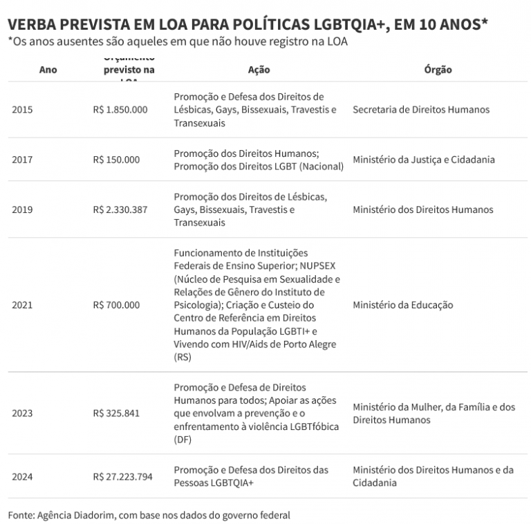 A LOA 2023, formulada no último ano do mandato de Jair Bolsonaro, destinava apenas R$ 325.841 para apoiar ações de prevenção e enfrentamento à violência LGBTfóbica, verba que seria administrada pelo extinto Ministério da Mulher, da Família e dos Direitos Humanos.