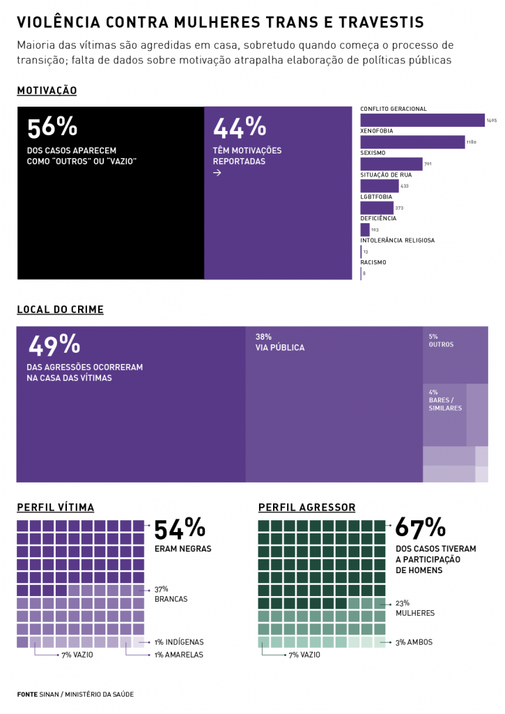 Enquanto mulheres são vítimas de 67% das agressões físicas no Brasil, o cenário de vulnerabilidade é ainda maior para trans e travestis. A própria residência é o lugar mais perigoso para elas (como para a maioria das mulheres cis), segundo dados do Sistema de Informação de Agravos de Notificação (Sinan, parte do Ministério da Saúde), compilados pelo Mapa da Violência de Gênero. Neste local, entre 2014 e 2017, foram cometidas 49% das agressões a esse grupo.