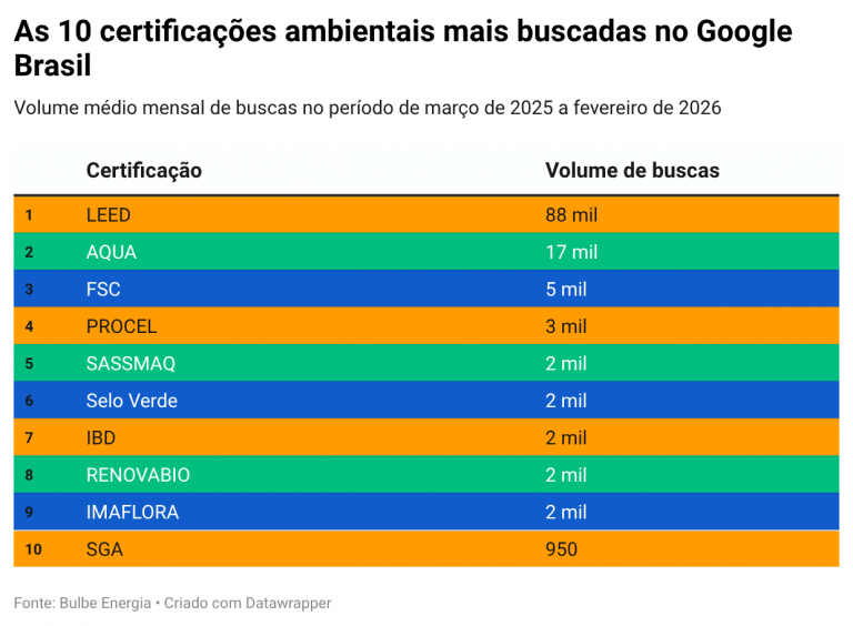 As certificações ambientais nunca foram tão procuradas pelos brasileiros. Um levantamento da Bulbe Energia, fornecedora de energia solar por assinatura, analisou o volume de buscas por selos de sustentabilidade no Google Brasil entre março de 2025 e fevereiro de 2026 e encontrou uma média de 123 mil pesquisas mensais por termos como LEED, AQUA, PROCEL e outros correlatos.