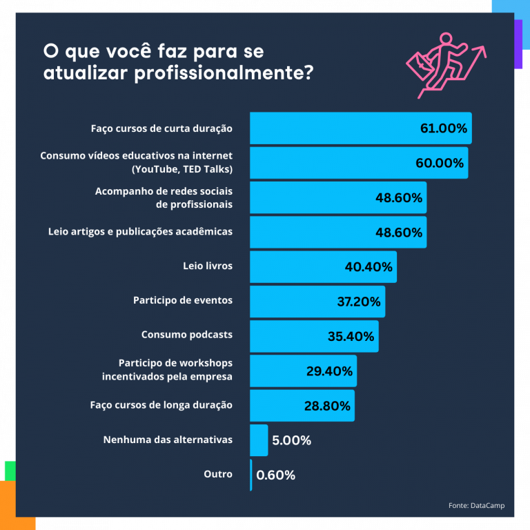 Dados da DataCamp, plataforma de cursos de dados e de inteligência artificial, que buscou entender o que os brasileiros fazem para não se sentirem defasados em suas profissões
