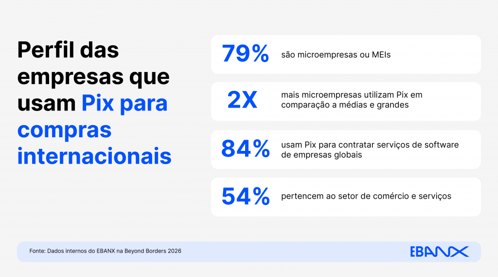 O Pix consolidou espaço no comércio digital e passou a liderar compras internacionais B2B feitas por microempresas e MEIs. Segundo a edição 2026 da Beyond Borders, estudo anual do EBANX, oito em cada dez empresas que utilizam Pix via a fintech para adquirir produtos e serviços de fornecedores globais são microempresas ou microempreendedores individuais.
