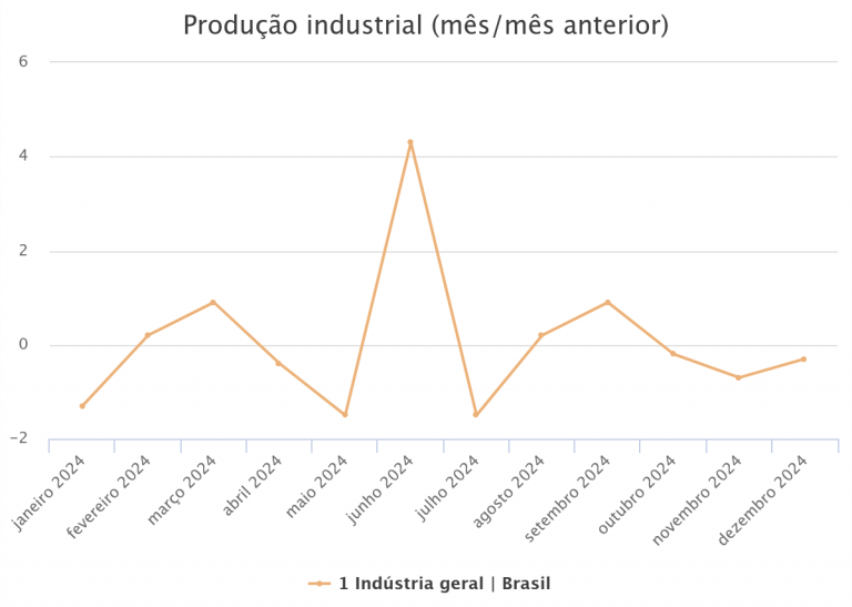 Apesar do saldo positivo no ano, a produção industrial registrou queda de 0,3% em dezembro de 2024 na comparação com novembro. Foi o terceiro mês consecutivo de recuo.