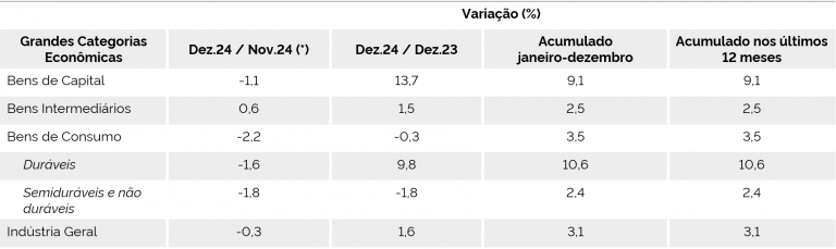 As grandes categorias econômicas mostraram desempenhos distintos. Bens de consumo duráveis cresceram 10,6%. Esse avanço foi impulsionado pela produção de eletrodomésticos, que subiu 23,8%, e de automóveis, com alta de 5,3%.