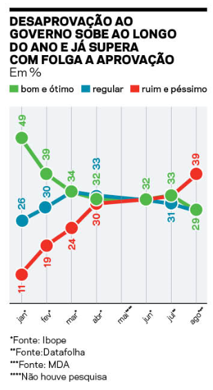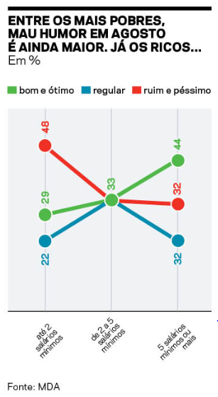 A economia expandiu-se 0,4% do primeiro para o segundo trimestre de 2018, acaba de informar o IBGE. Surpreende a crescente impaciência popular com Jair Bolsonaro? Em agosto, 39% achavam o governo ruim ou péssimo e 29%, bom ou ótimo, diz nova pesquisa CNT/MDA. Um descolamento entre as duas posições, empatadas ali por 30% desde abril. Na baixa renda, aquelas que ganham até dois salários mínimos, é pior para o governo, 48% de ruim ou péssimo. A esperança desaparece aos poucos. O otimismo quanto ao aumento da renda caiu de 33% em fevereiro para 28%. Idem com a criação de postos de trabalho, queda de 51% para 36%. Com Paulo Guedes no Ministério da Economia, 600 mil pessoas perderam o emprego até junho, outras 200 mil desistiram de procurar. Metade dos trabalhadores teme demissão. Mais gente acha o desempenho econômico do atual governo pior (28%) do que acha melhor que os anteriores (23%).