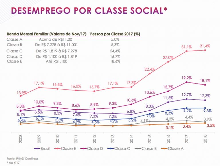 Na classe E, o desemprego chega a 30%, na D a 17%. Estimativa do Bradesco