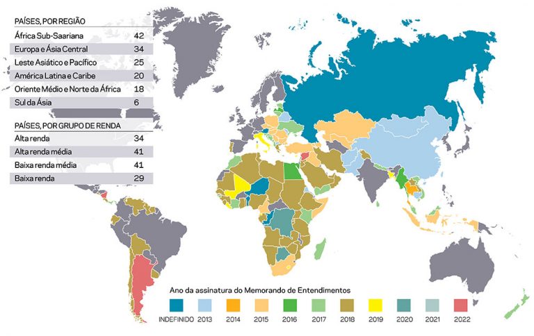 Até fevereiro de 2022, 145 países haviam assinado o Memorando de Entendimentos para fazer parte da Nova Rota da Seda (Belt and Road Initiative – BRI)