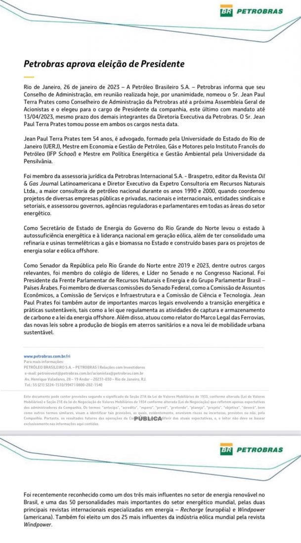 O Conselho da Petrobras aprovou por unanimidade nesta quinta-feira 26 o nome de Jean Paul Prates (PT-RN) para a presidência da empresa. Mais cedo, o petista renunciou ao mandato de senador.