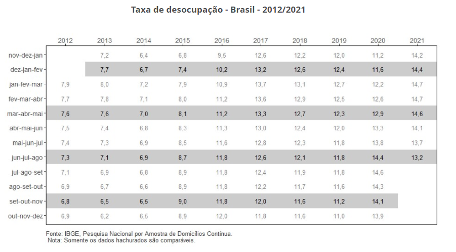 No levantamento anterior, referente ao trimestre encerrado em julho, a taxa de desemprego estava em 13,7%, atingindo 14,1 milhões de pessoas.