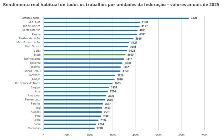 O valor anual do rendimento real dos trabalhadores brasileiros foi de 3.560 reais. No ano anterior, a média foi de 3.440 reais. Por região do País, o rendimento real habitual também reflete as desigualdades, registrando um volume acima dos 6 mil reais no DF e abaixo dos 2.500 reais no Maranhão. Confira a comparação: