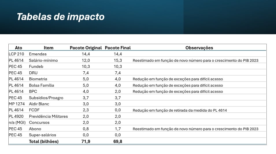 O Ministério da Fazenda divulgou na noite desta sexta-feira 20 sua estimativa sobre o impacto das mudanças promovidas pelo Congresso Nacional no pacote de corte de gastos. A pasta de Fernando Haddad (PT) previa uma economia de 71,9 bilhões de reais, mas as alterações a reduziram para 69,8 bilhões.