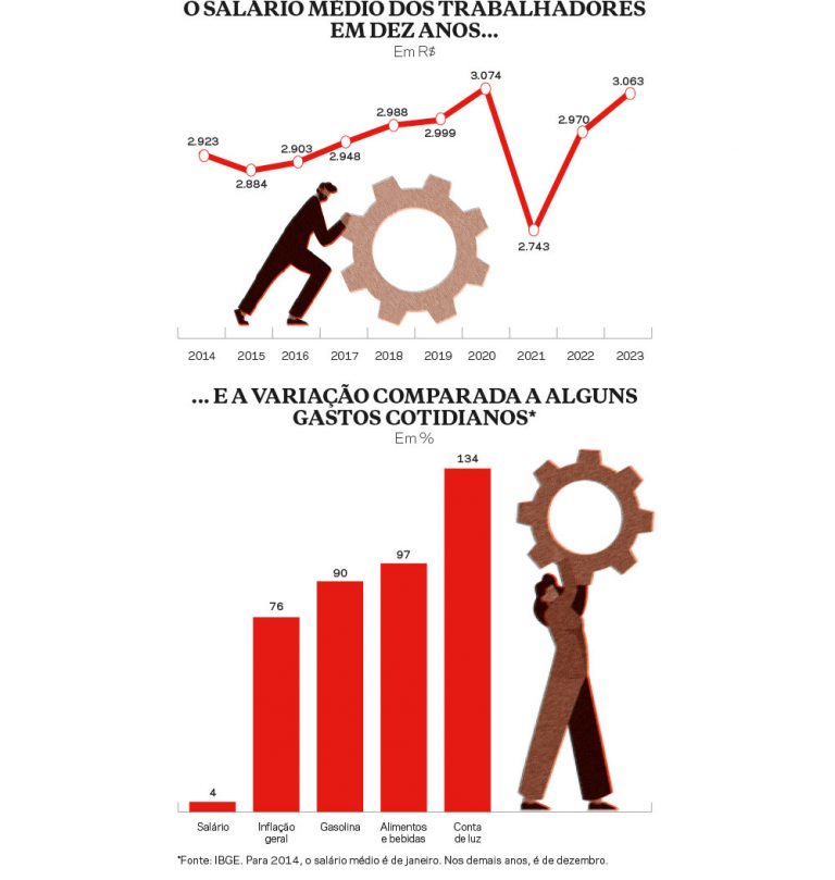 Vem aí o 1° de Maio e os 100 milhões de trabalhadores brasileiros têm pouco a comemorar. A taxa de desemprego está nos menores níveis vistos recentemente no País, entre 7,5% e 8%, mas o salário médio permanece o mesmo há uma década, o que significa empobrecimento e um cotidiano bem mais duro. Em janeiro de 2014, a renda mensal média de quem vivia do trabalho era de 2.923 reais. Em dezembro de 2023, de 3.063 reais, 4% a mais. Nesse período de dez anos, o valor oscilou entre 2,8 mil e 3,1 mil. A inflação geral (IPCA) no período foi de 76%. A gasolina subiu 90%. Alimentos e bebidas, 97%. A conta de luz, 134%. “Essa perda de poder de compra é uma dimensão não visível no salário médio. Produz um brutal arrocho. O orçamento não cabe dentro do salário”, diz o sociólogo e consultor para temas trabalhistas Clemente Ganz Lúcio, ex-diretor do Dieese, o Departamento Intersindical de Estatística e Estudos Socioeconômicos.