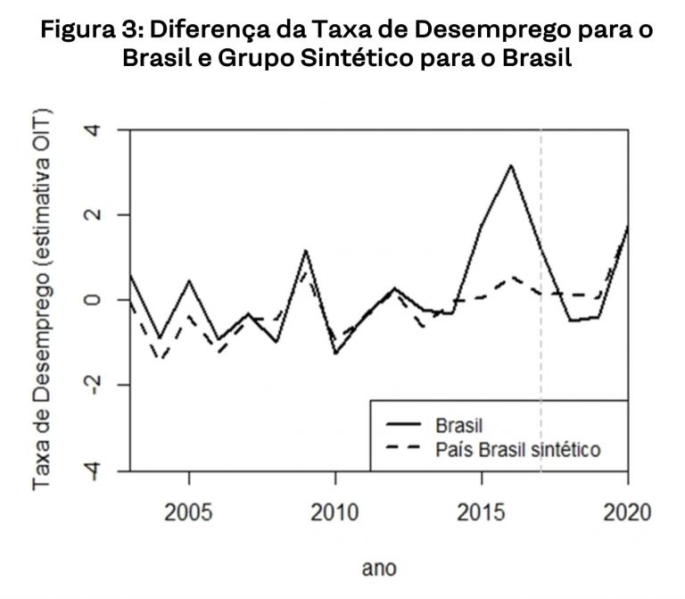 “Em resumo, o método constrói o grupo de controle de modo que haja pouca diferença entre o Brasil real e o Brasil sintético no período pré-intervenção para a taxa de desemprego e demais variáveis utilizadas. O efeito da reforma consiste na diferença entre a taxa de desemprego do país verdadeiro e a do sintético no período pós-intervenção, ou seja, entre 2018 e 2020.”