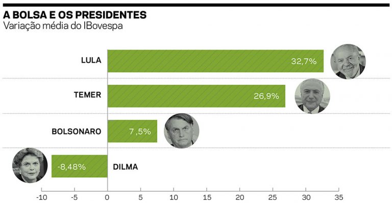 É notória a antipatia da Faria Lima pelo ex-presidente Lula. A Bolsa de Valores e os bancos tiveram, no entanto, um desempenho expressivamente melhor sob o governo do petista, mostra levantamento da Comdinheiro. Entre 2003 e 2010, o Ibovespa acumulou alta média de 32,7%, enquanto entre 2019 e 2021, a média foi de 7,5%. Chegou a 26,9% no mandato de Michel Temer, e recuou 8,48% sob Dilma Rousseff. Filipe Ferreira, diretor-financeiro da ComDinheiro, destaca o fato de que, no primeiro ano de Lula, a Bolsa vinha de uma queda de 17% em 2002 e se beneficiou da bonança das commodities, assim como da política expansionista de crédito do PT. A Comdinheiro analisou ainda a performance das ações dos maiores bancos. O Itaú teve retorno médio de 38% sob Temer, 34,2% com Lula, e 2% com Dilma. Com Bolsonaro, as ações caíram 5%. Os papéis do Bradesco desempenharam melhor sob Temer, seguido por Lula e Dilma, com altas médias de 45,6%, 38,7% e 0,94%, respectivamente. Com Bolsonaro, perderam 5%. As ações do Banco do Brasil subiram 56,2% durante o mandato de Temer e 54,2% com Lula. Com Bolsonaro e Dilma, caíram 7,9% e 5%.