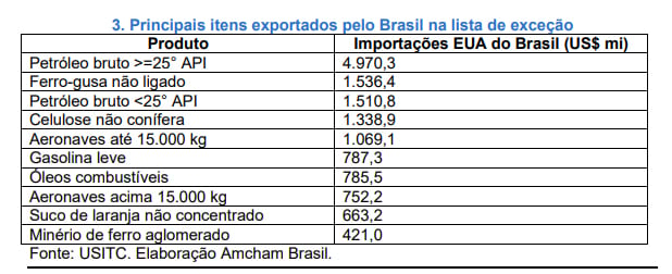 Confira os principais itens exportados pelo Brasil e que estão na lista de exceção, segundo a Amcham: