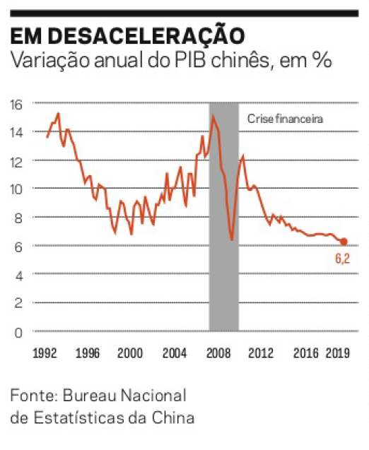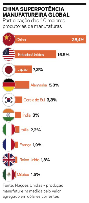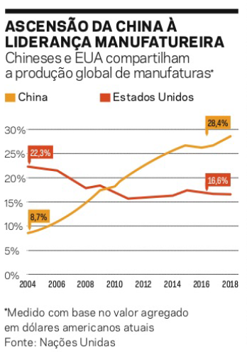 Durante a primeira década do novo milênio, a taxa de crescimento média anual da economia chinesa foi de 10,5%, contra 1,7% dos EUA e 0,9% da Alemanha. No fim da década, a China respondia por 42% da produção mundial de televisores em cores, 67% dos produtos de vídeo, 53% dos telefones móveis, 97% dos PCs e 62% das câmeras digitais.