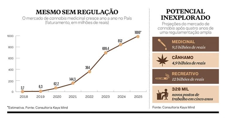 A projeção diz respeito apenas à cadeia produtiva da cannabis medicinal. Já o cânhamo – subespécie da maconha sem efeito psicoativo, que possui uma infinidade de aplicações industriais – pode movimentar 4,9 bilhões de reais a partir do quarto ano de uma regulamentação ampla, segundo estimativa da Kaya Mind. O debate sobre a liberação do uso recreativo da maconha ainda engatinha no País, mas poderia ganhar tração, pois representa um mercado ainda mais promissor: se fosse regulamentado, poderia gerar 12 bilhões de reais por ano. Somados, os três segmentos têm capacidade de criar até 328 mil postos de trabalho em cinco anos.