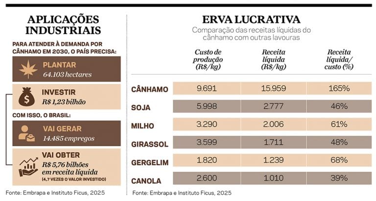Com a regulamentação do cânhamo, o Brasil também tem muito a lucrar com suas inúmeras aplicações industriais. Hoje, 60 países já o produzem e mais de 110 autorizam sua importação. Em parceria com o Instituto Ficus, a Embrapa elaborou um relatório detalhado sobre o tema, destacando o potencial da fibra extraída da planta para impulsionar 21 setores econômicos, incluindo os de vestuário, construção civil, cosméticos, alimentos e até o segmento naval. Tecidos feitos com cânhamo, por exemplo, permitem ventilação como o algodão e têm resistência semelhante à do linho. Já os tijolos de biomassa fabricados com a planta se destacam por serem “respiráveis”. Rica em ômega 3 e 6, a erva também vem ganhando fama como um “superalimento”, ideal para reforçar suplementos nutricionais.