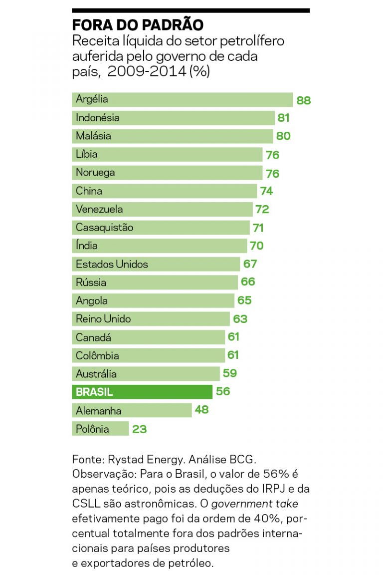 Mais uma vez, no caso do leilão do excedente, o Brasil estará na contramão do resto do mundo. “A participação governamental de 653,17 bilhões de reais corresponde a 59% da receita líquida total, muito menor que a parcela do governo de países produtores e exportadores de petróleo. Na Noruega, essa participação é de 76%. Na Arábia Saudita, de 100%, em razão do monopólio estatal de uma empresa pública”, compara Lima.