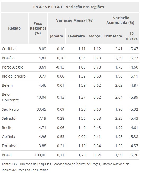 O IPCA-15, a prévia da inflação, foi calculado a partir de preços coletados no período de 13 de fevereiro a 17 de março de 2025 e comparados com aqueles vigentes de 15 de janeiro a 12 de fevereiro de 2025. O indicador refere-se às famílias com rendimento de 1 a 40 salários-mínimos e abrange as regiões metropolitanas das 11 cidades citadas.