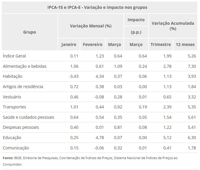 Em 12 meses, o IPCA-15 acumula alta de 5,26%, acima dos 4,96% observados nos 12 meses imediatamente anteriores. Em março de 2024, o IPCA-15 foi de 0,36%.