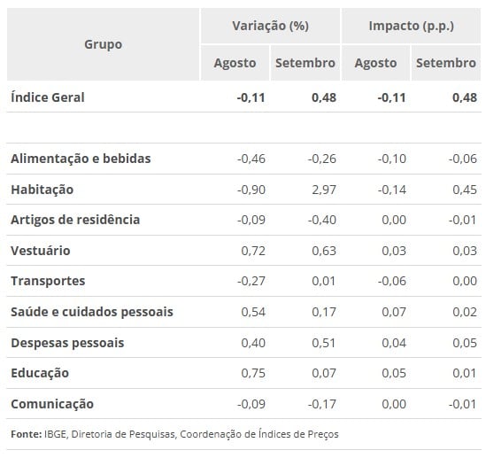 Outros dois grupos (artigos de residência e comunicação) também tiveram redução de preços em setembro. Veja: