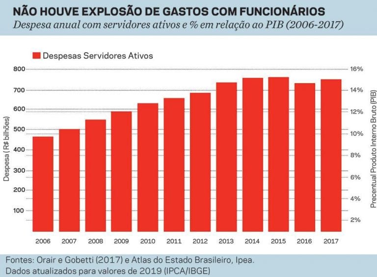 O recurso encontrado pelo governo para justificar a presumida necessidade de arrocho incessante distribuído em inúmeras PECs é manipular números para alegar explosão de despesas com o funcionalismo e inchaço do Estado “gastador”. São manobras primárias, mostra a Associação Nacional dos Servidores da Carreira de Especialista em Meio Ambiente. “Para justificar a reforma, o governo usou a estratégia cherry picking, coleta seletiva de dados que confirmem uma tese, mas sem considerar o todo composto por informações que possam contradizê-las. Como o governo fez isso? ‘Esquecendo’ de descontar a inflação.” Os dados mostrados pelo governo, descreve a Ascema, são de gastos com salários que saltariam de 44,8 bilhões de reais em 2008 para 109,8 bilhões em 2029, mais que dobrando, portanto, nessa conta da entidade, mas, considerada a inflação, caem para 58,8 bilhões. “O governo não quer que os cidadãos saibam que os gastos com servidores aumentaram 31% nos últimos 12 anos, em vez de 145%, uma curva praticamente estável no aumento das despesas com pessoal ativo do Executivo Federal.”
