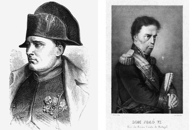 Quando a tropa napoleônica alcançou Portugal, D. João VI exportou seu atraso para o Brasil – Imagem: iStockphoto e Acervo da Biblioteca Nacional