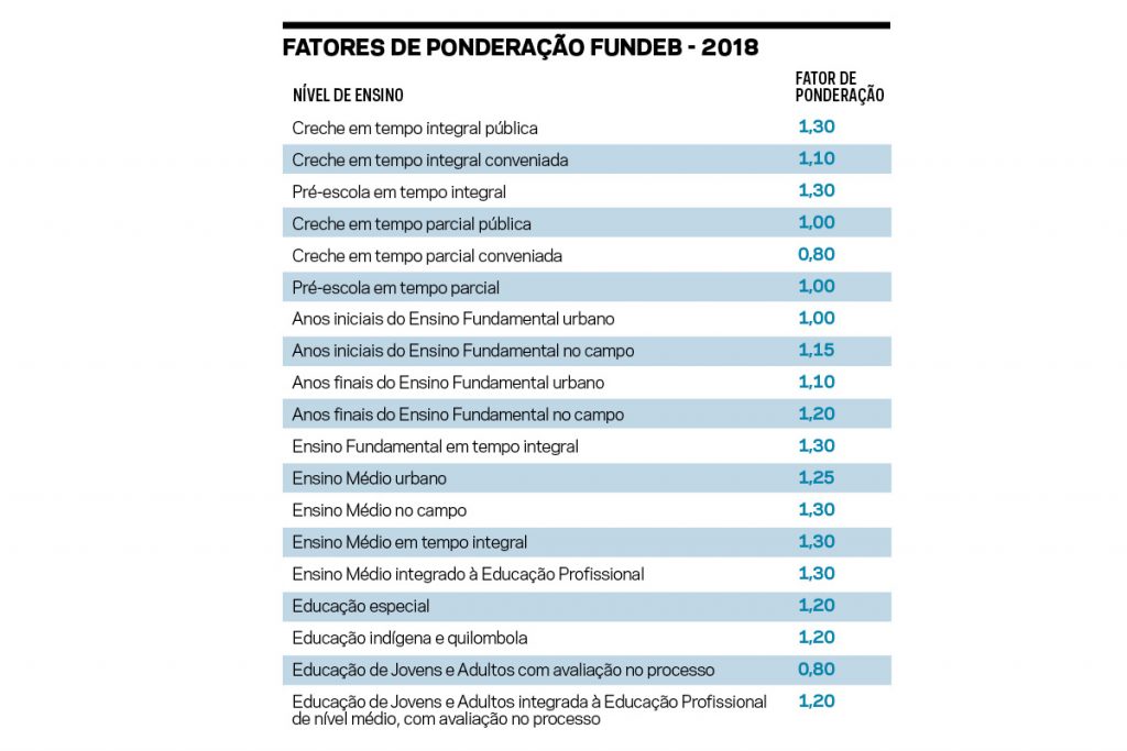 Sobre os repasses incidem um fator de ponderação que é diferente em cada etapa da educação, uma vez que cada uma apresenta demandas de financiamento específicas. Quanto mais o fator de ponderação estiver perto do zero, menor o valor repassado para os alunos na etapa/modalidade.