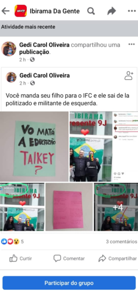 Além dos ataques no perfil pessoal de Carlos, a foto diante da bandeira começou a ser compartilhada por perfis bolsonaristas. No dia 10, às 13h11, Gedi Carol Oliveira postou a imagem destacando o nome do professor Carlos e anexou fotos dos cartazes produzidos pelos estudantes, com dizeres como “educação para todos, todas e todes”. “Você manda seu filho para o IFC e ele sai de lá politizado e militante de esquerda”, escreveu Gedi. A publicação recebeu 16 curtidas e três compartilhamentos, um deles feito pelo próprio Gedi, no grupo Ibirama Urgente, que tem mais de cinco mil participantes no Facebook.