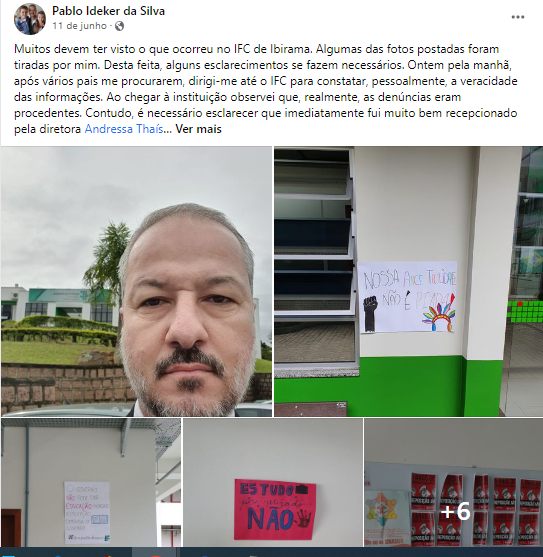 Pablo é consultor jurídico da prefeitura de Dona Emma, município a aproximadamente 28 quilômetros de Ibirama. No post do Facebook, ele diz que foi recebido por duas diretoras do campus Ibirama, Andressa Thaís Schwingel e Sônia Imhof. Segundo o seu post, elas teriam afirmado que o protesto partiu de professores “militantes sindicalizados” que extrapolaram as suas funções “no objetivo de doutrinar” os adolescentes. A Agência Pública contatou duas servidoras por e-mail, mas elas não responderam até a publicação da reportagem