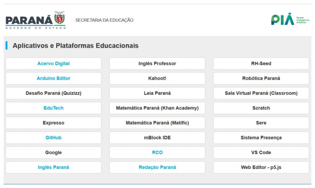 Lista de plataformas e aplicativos da secretaria de educação do Paraná. Créditos: Reprodução