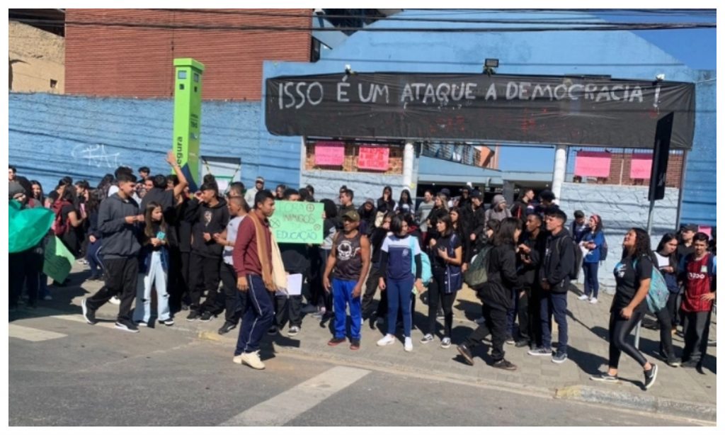Manifestação de alunos em frente ao Colégio Estadual Professor Edimar Wright, em Almirante Tamandaré, que teve diretores afastados. Foto: APP Sindicato.