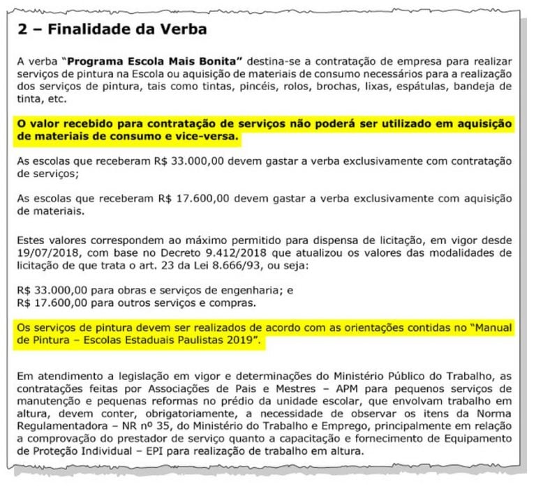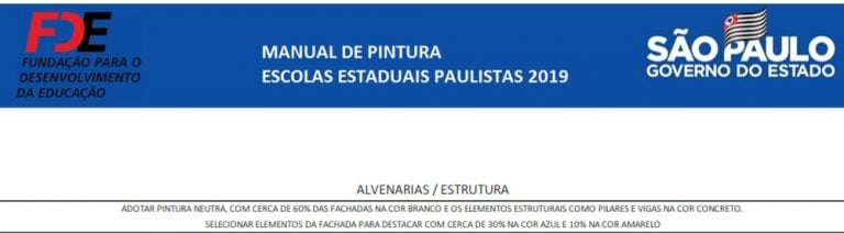 A ação de pintura das escolas faz parte do programa “Escola Mais Bonita” lançado pelo governo no início do ano, com investimento anunciado de 1,1 bilhão. Além do manual de pintura, as unidades receberam um manual de instrução de como utilizar a verba. O documento afirma que a quantia deve ser utilizada para contratar serviços de pintura ou adquirir materiais de consumo necessários à ação, como tintas, pincéis, rolos, entre outros, não podendo ser utilizada para materiais de consumo. O texto também reforça que os serviços de pintura devem ser realizados de acordo com as orientações do Manual de Pintura.