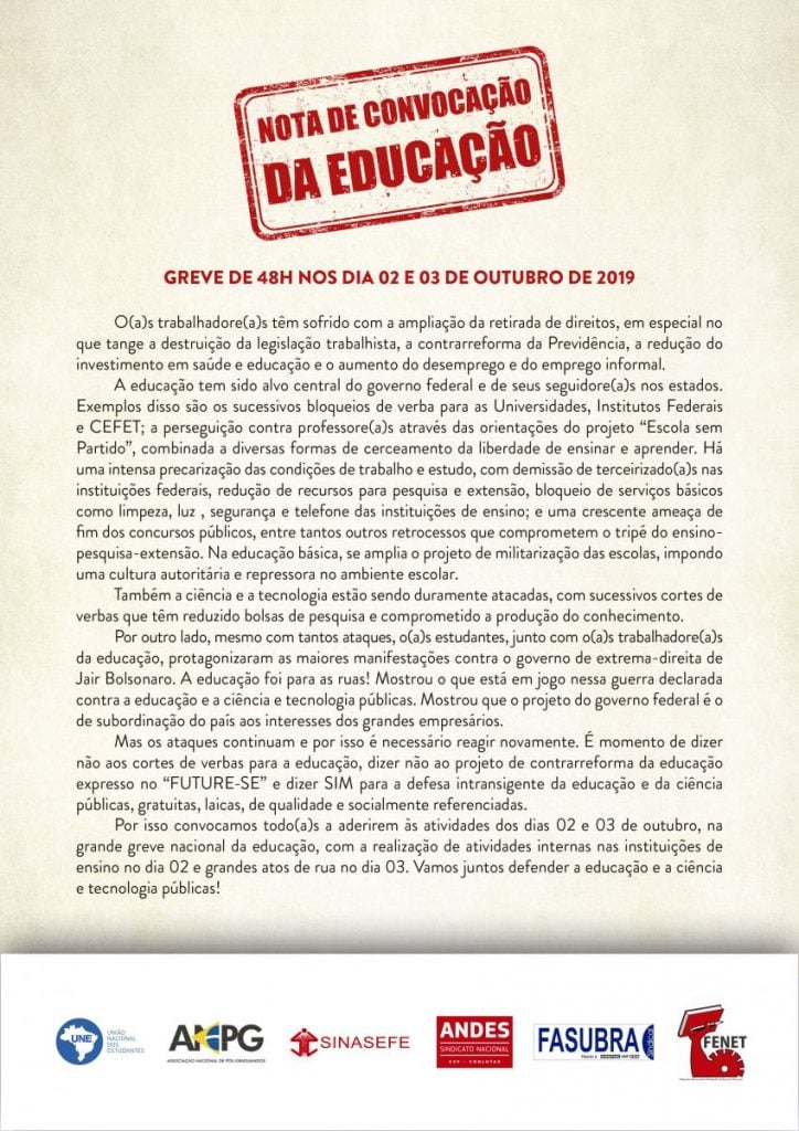 Entidades educacionais como o Andes, ANPG, SINASEFE, Fasubra e Fenet, em parceria com a UNE, publicaram uma nota de convocação. Confira!