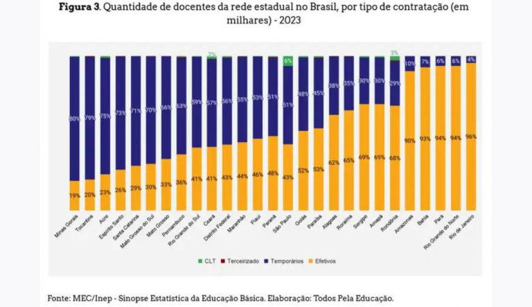 “Em tese, o ideal é que você consiga suprir todo o seu quadro com professores efetivos. E a figura do professor temporário é para suprir eventual ausência. Então, por exemplo, um professor vai trabalhar na secretaria, você precisa de um professor temporário para cumprir aquela carga horária. Ou ele foi afastado, readaptado, a gente sabe que acontece esse tipo de coisa, né?”, diz o gerente de Políticas Educacionais do Todos pela Educação, Ivan Gontijo. “Professores temporários são super importantes para suprir o quadro, para garantir que os alunos tenham aula com profissionais com formação adequada, mas esse artifício da contratação temporária deveria ser exceção à regra”, defende.