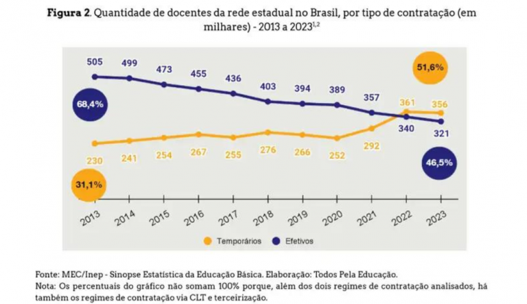 O número de professores concursados passou de 505 mil em 2013, o que representava 68,4% do total de docentes nas redes estaduais, para 321 mil em 2023, ou 46,5% do total. Já os contratos temporários superaram os efetivos em 2022 e, em 2023 chegaram aos 356 mil, representando 51,6% do total de contratações. Em 2013, eram 230 mil, o equivalente a 31,1% do total.