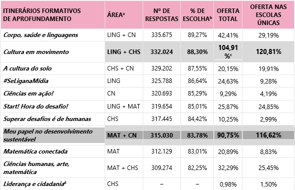 Itinerários formativos obrigatórios no Ensino Médio. As linhas em destaque representam os dois itinerários formativos mais frequentemente ofertados nas escolas