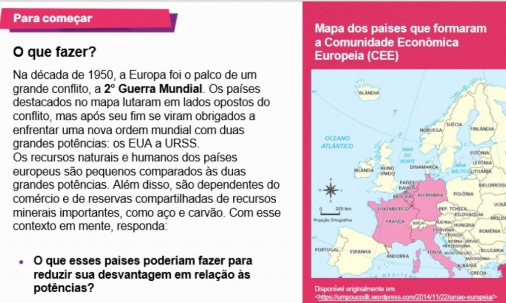 “Na década de 1950, a Europa foi o palco de um grande conflito, a 2ª Guerra Mundial”, diz um trecho do material que se encontra disponível no Centro de Mídias da Educação de São Paulo, um repositório de conteúdos da Secretaria de Educação.
