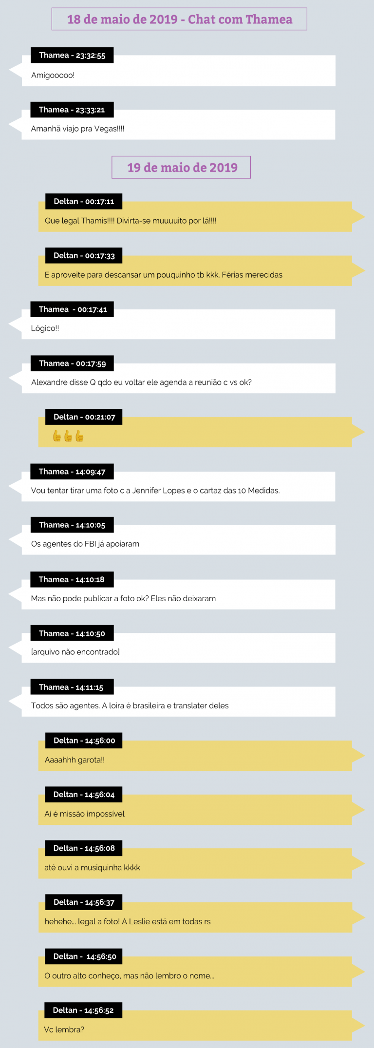 Em um chat com Deltan em 18 de maio de 2016 constante do arquivo entregue ao site The Intercept Brasil, a procuradora Thaméa Danelon, ex-coordenadora da Força-Tarefa em São Paulo, brincou antes uma viagem para os EUA: “Vou tentar tirar uma foto c a Jennifer Lopes e o cartaz das 10 Medidas”, brinca ela. “Os agentes do FBI já apoiaram. Mas não pode publicar a foto ok? Eles não deixaram”, explica Thaméa, enviando a foto a seguir.