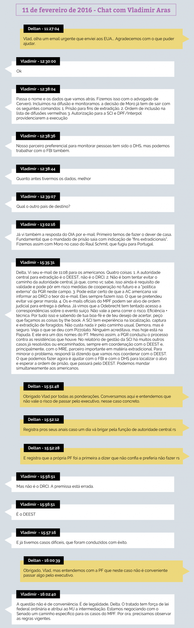 Às 11:27:04, Deltan pede que Aras olhe um email enviado para os Estados Unidos. Aras se surpreende com o teor: tratava-se de um pedido de extradição de um suspeito da Lava Jato. Não fica claro quem é a pessoa a quem se referem. O pedido, informal, havia sido enviado ao Escritório de Assuntos Internacionais (OIA, na sigla em inglês) diretamente por Dallagnol, sem passar pela Secretaria Cooperação Internacional da PGR nem pelo Departamento de Recuperação de Ativos e Cooperação Jurídica Internacional (DRCI), do Ministério da Justiça, autoridade central responsável, de acordo com um tratado bilateral. O diálogo dá a entender que um mandado de prisão ainda estava por ser decretado pelo então juiz Sergio Moro.