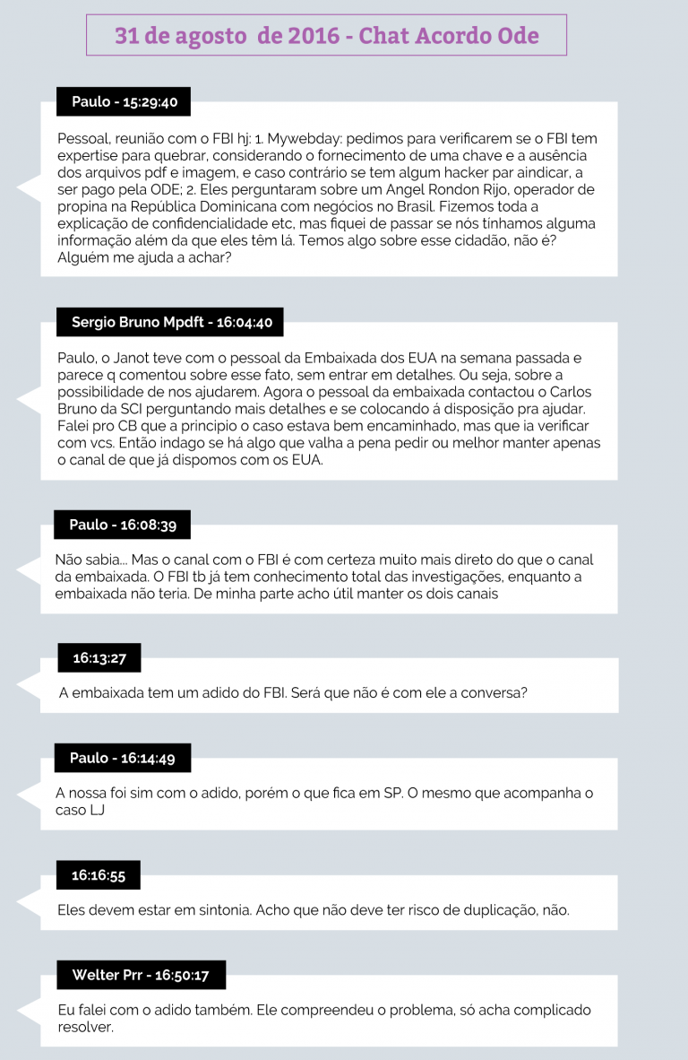 Naquele mesmo ano, alguns meses depois, a relação com a polícia americana voltaria a ser tema de debate entre os procuradores, desta vez pelo Chat Acordo ODE, onde discutiam o contrato de leniência com a construtora Odebrecht.