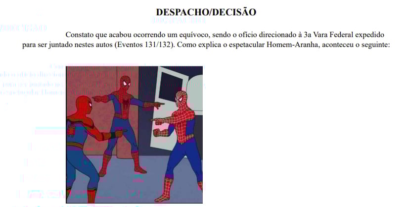 A juíza Karina Dusse, substituta da 1ª Vara Federal de Volta Redonda (RJ), usou um meme do Homem Aranha em um despacho para alertar, com humor, sobre um erro na movimentação do processo.