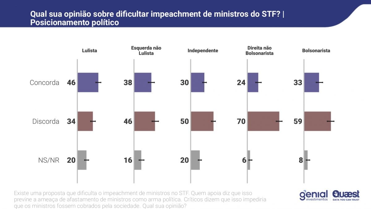 Uma pesquisa Quaest divulgada nesta sexta-feira 19 aponta que 51% dos eleitores discordam da proposta de dificultar o impeachment de ministros do Supremo Tribunal Federal, enquanto 33% concordam e 16% não sabem ou não responderam.