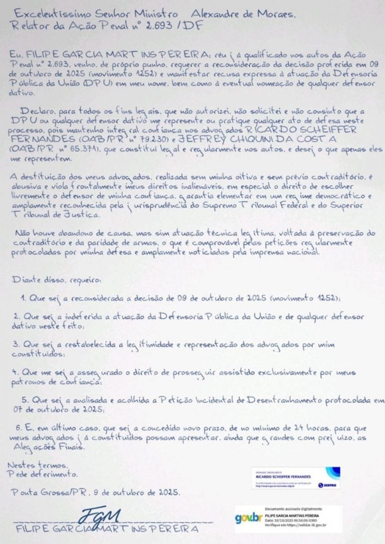 Em sua carta ao Supremo, Martins classificava a decisão de Moraes como abusiva, recusava a representação da DPU determinada pelo ministro e pedia que, em último caso, fosse concedido um novo prazo de 24 horas para apresentação das alegações finais no processo. Leia: