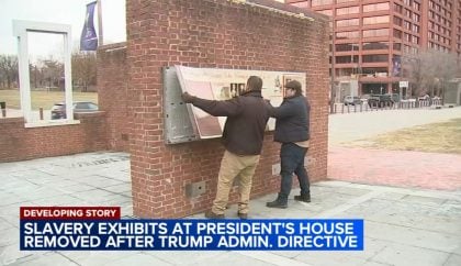 “Sem aviso prévio à cidade da Filadélfia, o Serviço Nacional de Parques removeu obras de arte e painéis informativos no local da Casa do Presidente que fazem referência à escravidão”, diz a ação.