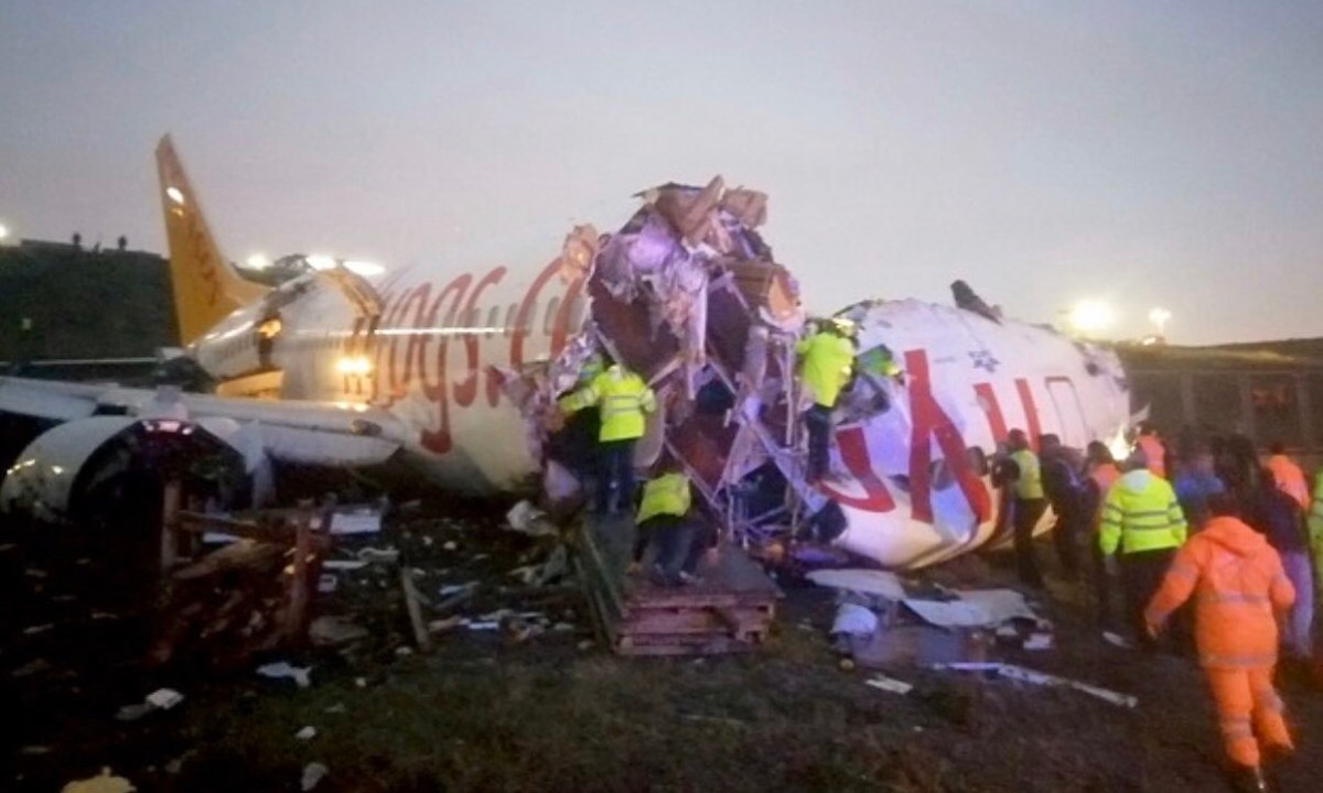 A fuselagem da aeronave, da companhia privada Pegasus, partiu em dois e pegou fogo depois de sair da pista do aeroporto internacional Sabiha Gökçen, escorregadia em razão da forte chuva que cai em Istambul, segundo imagens transmitidas pelo canal CNN-Türk.