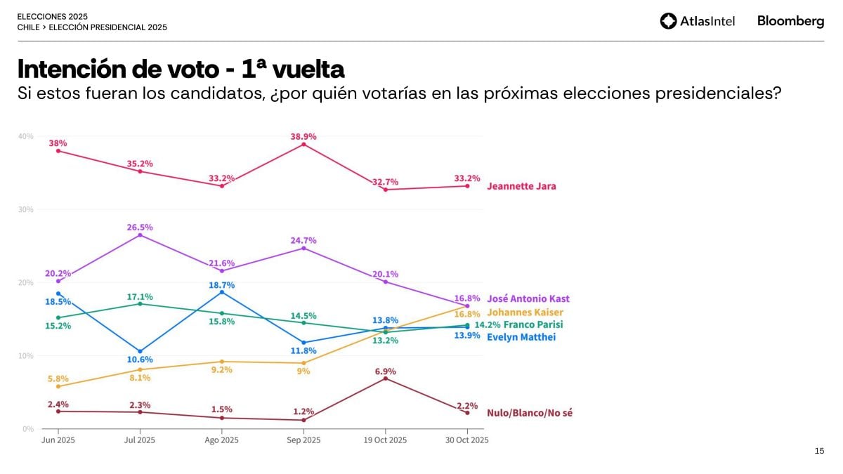 A candidata do Partido Comunista, Jeannette Jara, lidera o primeiro turno da disputa pela Presidência do Chile com 33,2% das intenções de voto, segundo uma pesquisa AtlasIntel divulgada nesta sexta-feira 31. A votação ocorrerá em 16 de novembro.